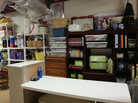 The table is cleared and ready for working. The scrapbooking supplies are all neatly organized and stored.