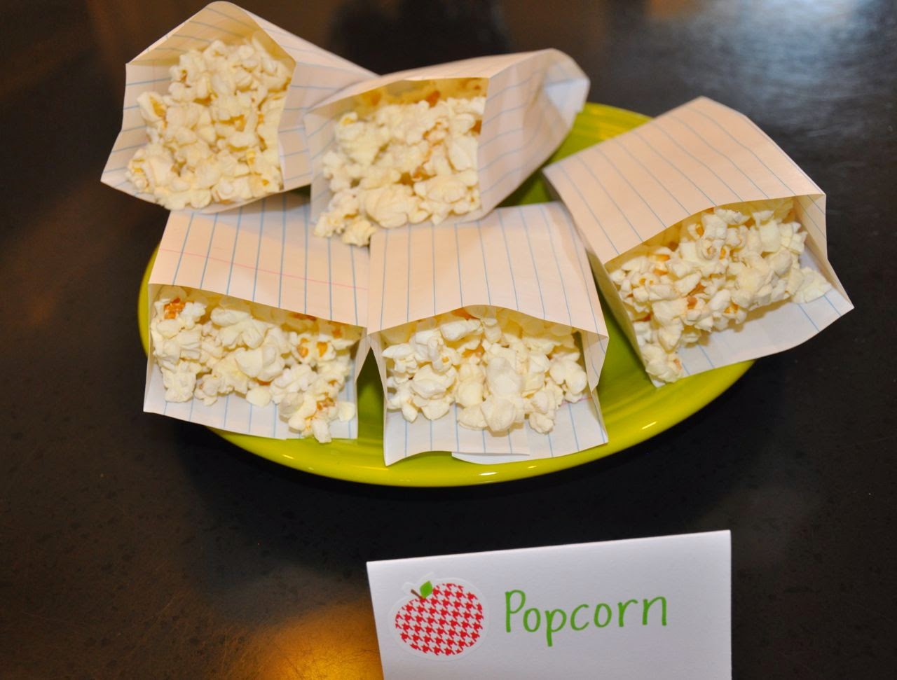 Both snack ideas were from Pinterest. Jimmy made the popcorn sacks (out of notebook paper), and he helped me get the "chalk" out of the straws. (I melted white chocolate candy discs, sucked them into a straw, and froze them until they were hard).